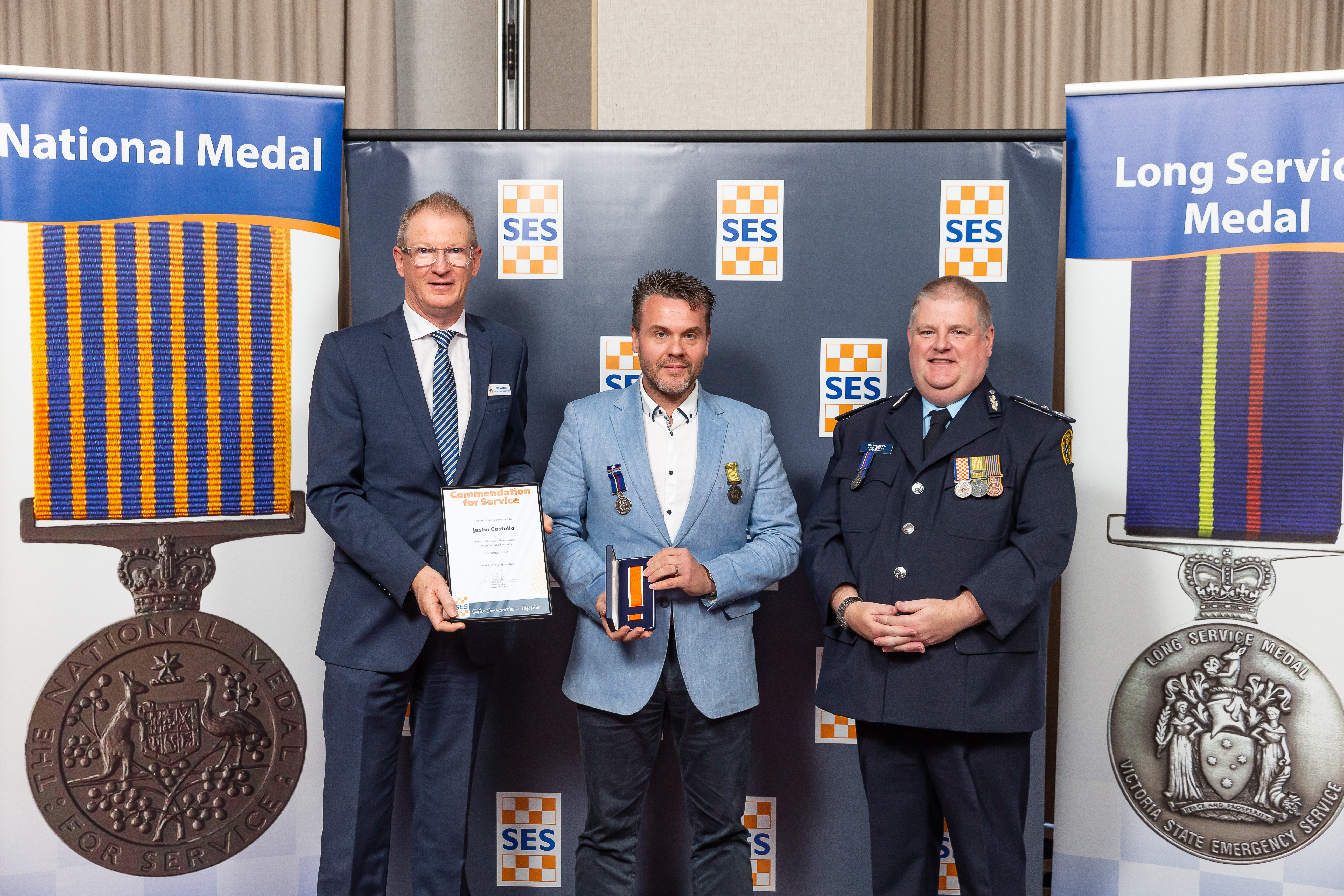 Long-time Victoria State Emergency Service (VICSES) volunteer and current staff member Justin Costello has been awarded the rare Commendation of Service Award, following his life-saving role in the 2022 rescue of a teenager from a flooded stormwater drain near Altona Meadows.